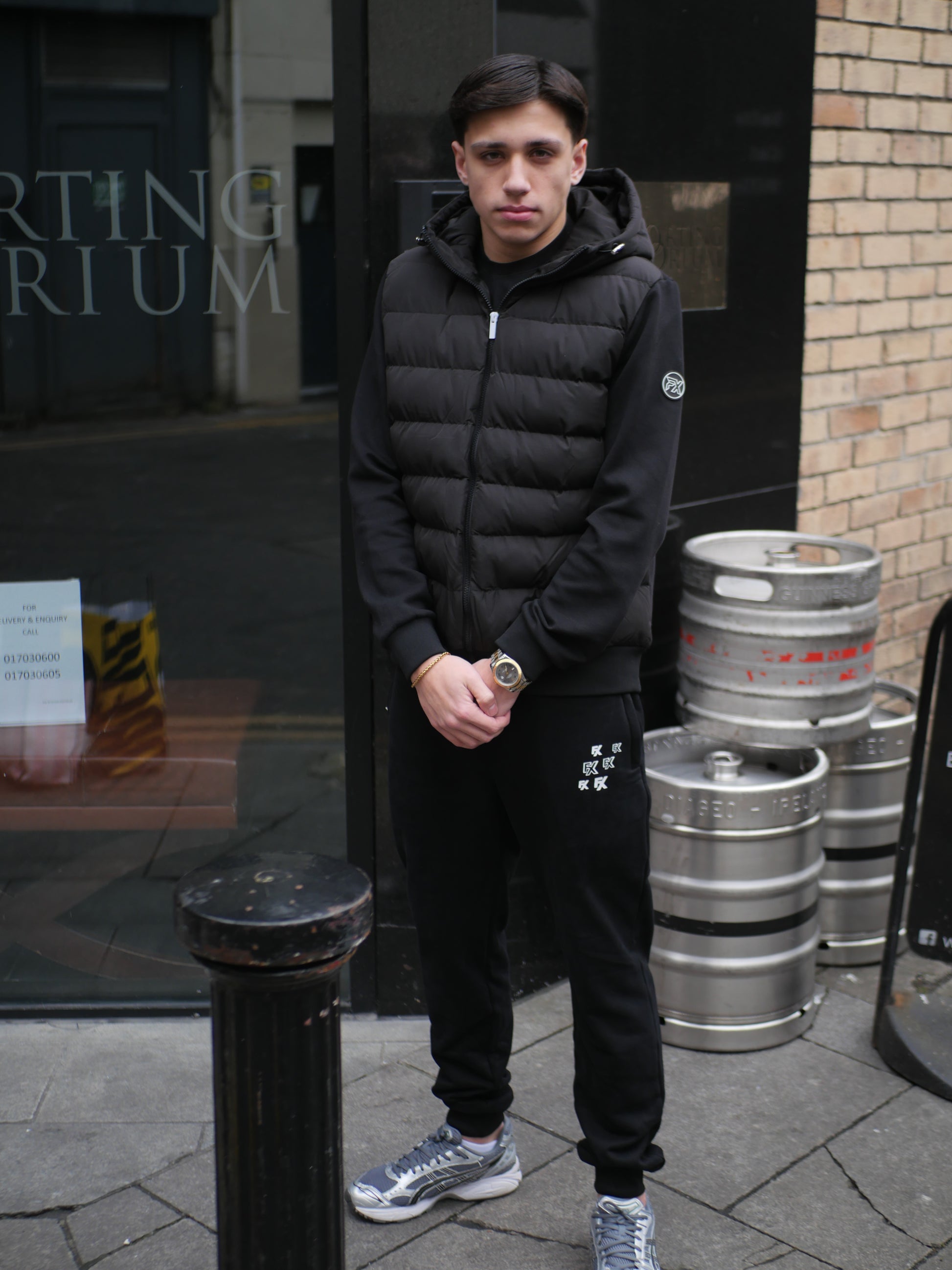 COTTON SLEEVE FEATHER DOWN JACKET PERFECT FOR NIGHTS OUT AND EVERYDAY WEAR WHITE METAL ZIPPER PULLERS AND RUBBER CIRCLE BADGE ON ARM